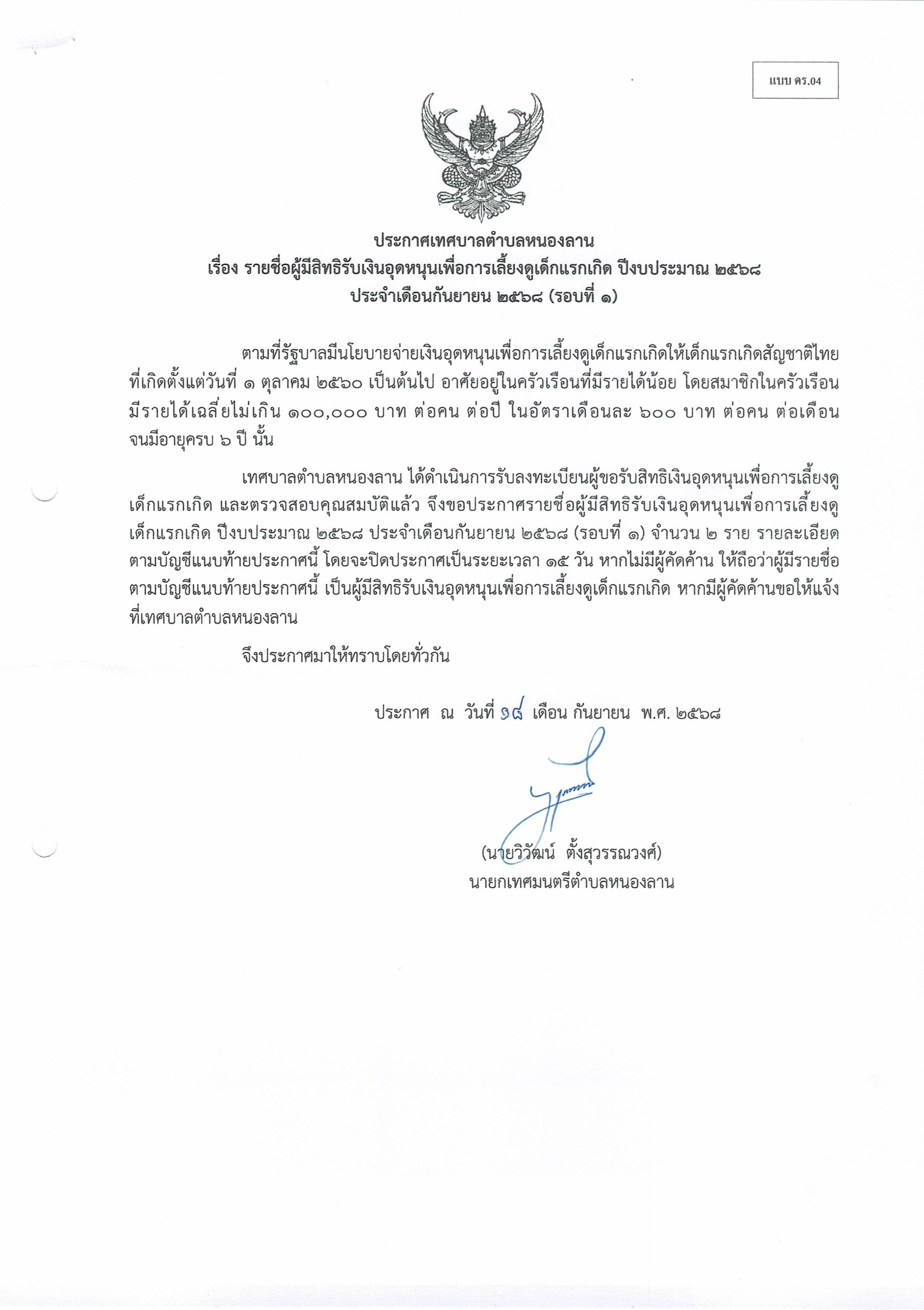ประกาศเทศบาลตำบลหนองลาน เรื่องรายชื่อผู้มีสิทธิรับเงินอุดหนุนเพื่อการเลี้ยงดูเด็กแรกเกิด ประจำเดือนกันยายน 2568 (รอบที่ 1)